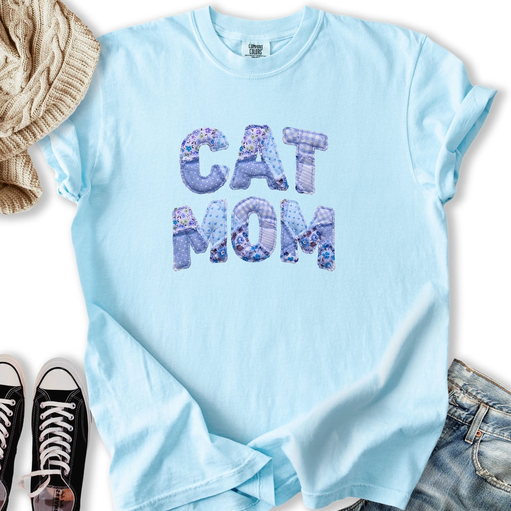 Blue Faux Patchwork Cat T-Shirt